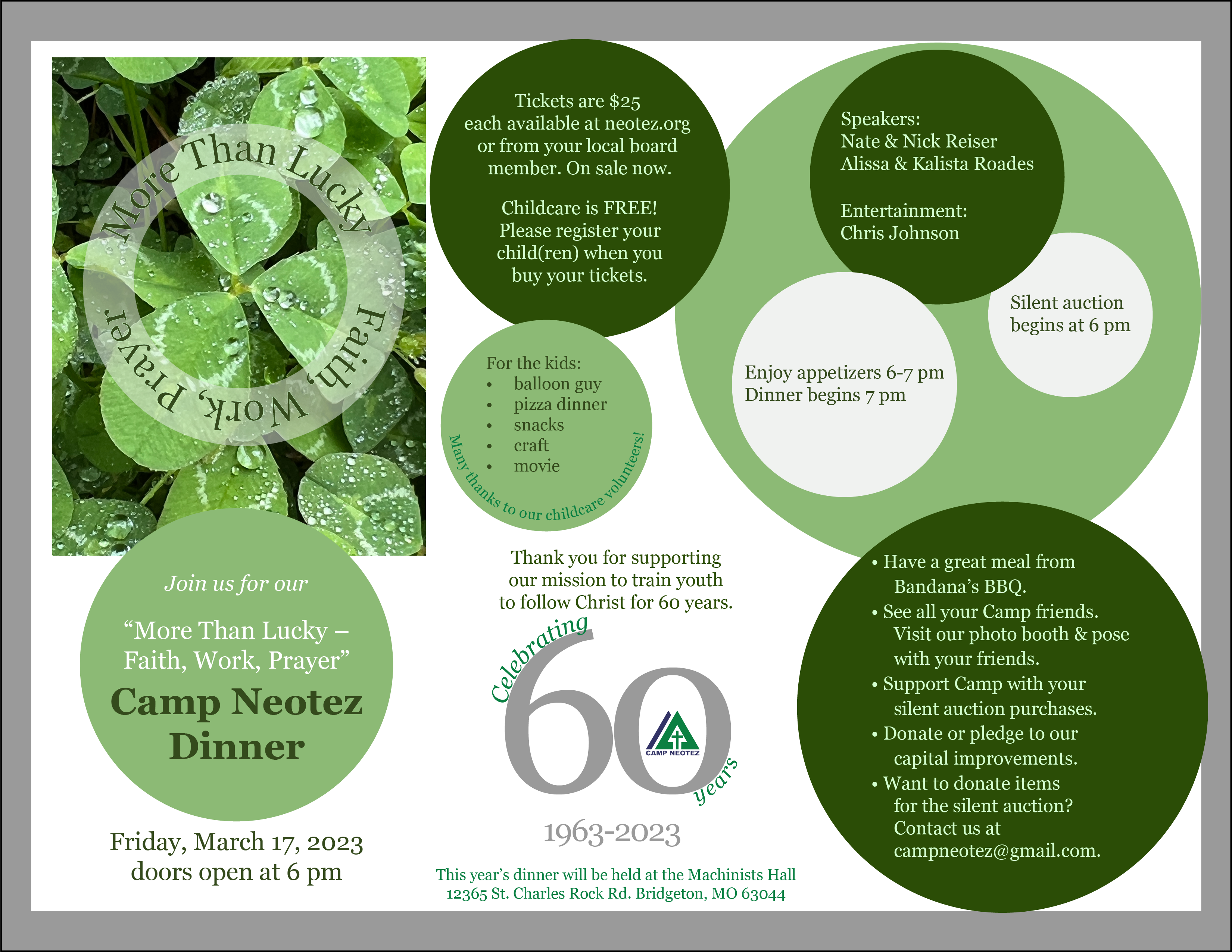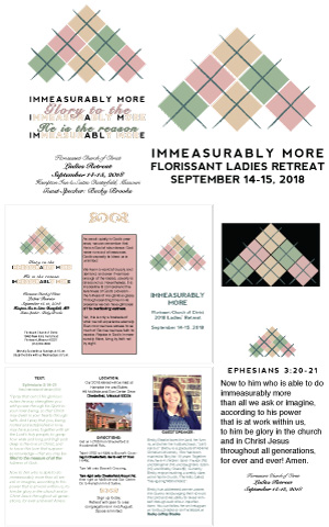 hotel brochure front & photographySuggested biology dept. logoBackpack Giveaway SignsInvite for camp cooks-websiteRetreat brandingNon-profit dinner flyerInvite for staffers-websiteDinner slide on websiteImmeasurably More scarf designRecipe – Illustrator gradient meshNon-profit informational poster – IllustratorCamp Ne-O-Tez flier with photo of kids after shaving cream fight.Single-ink poster